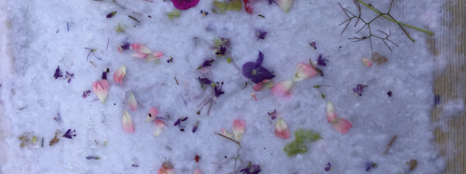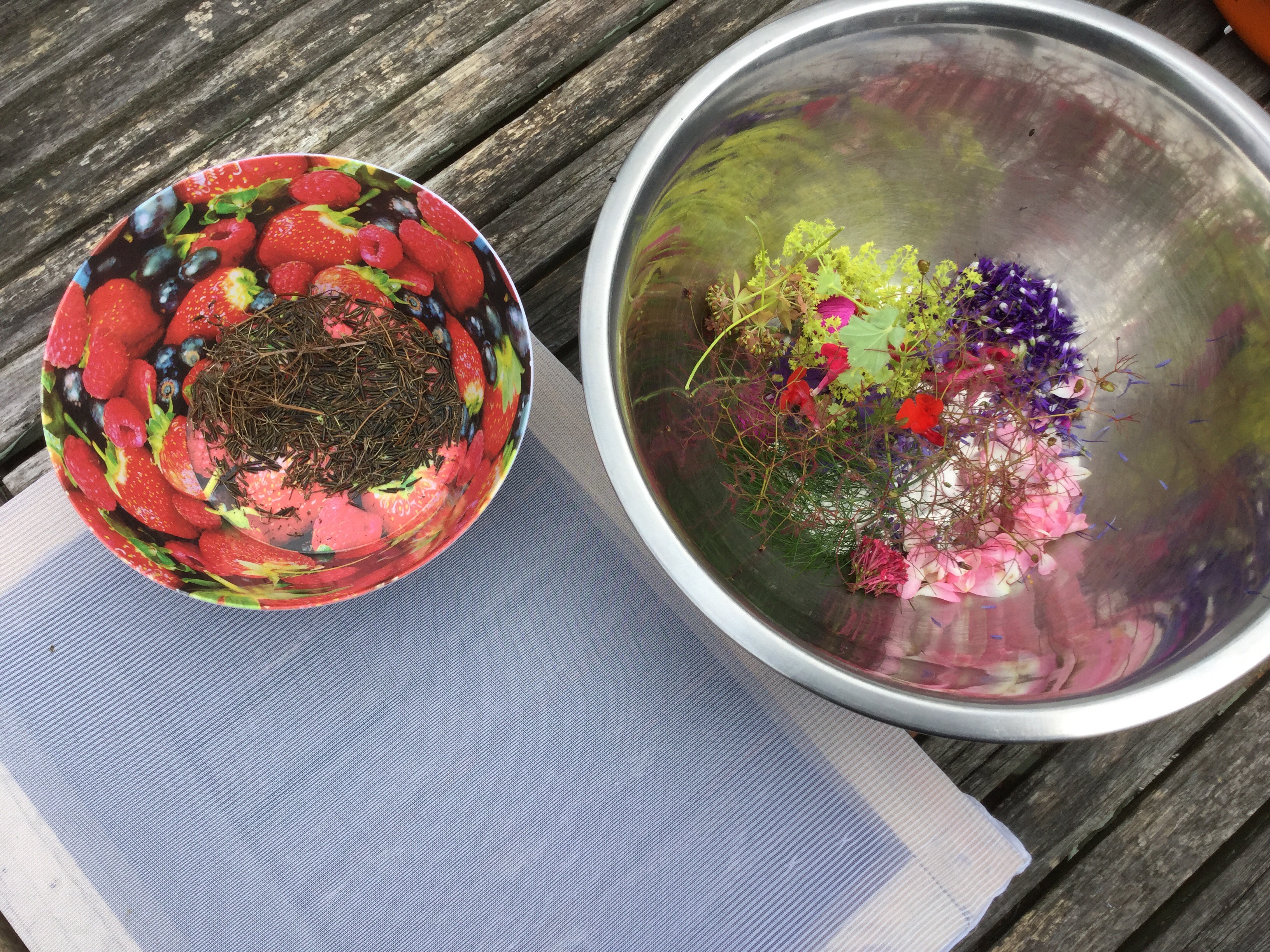 I made a small frame from oddments of wood and stretched an old piece of net curtain over it stapling into place. Then I added more water to the mush and collected flowers, petals and seeds from the garden.