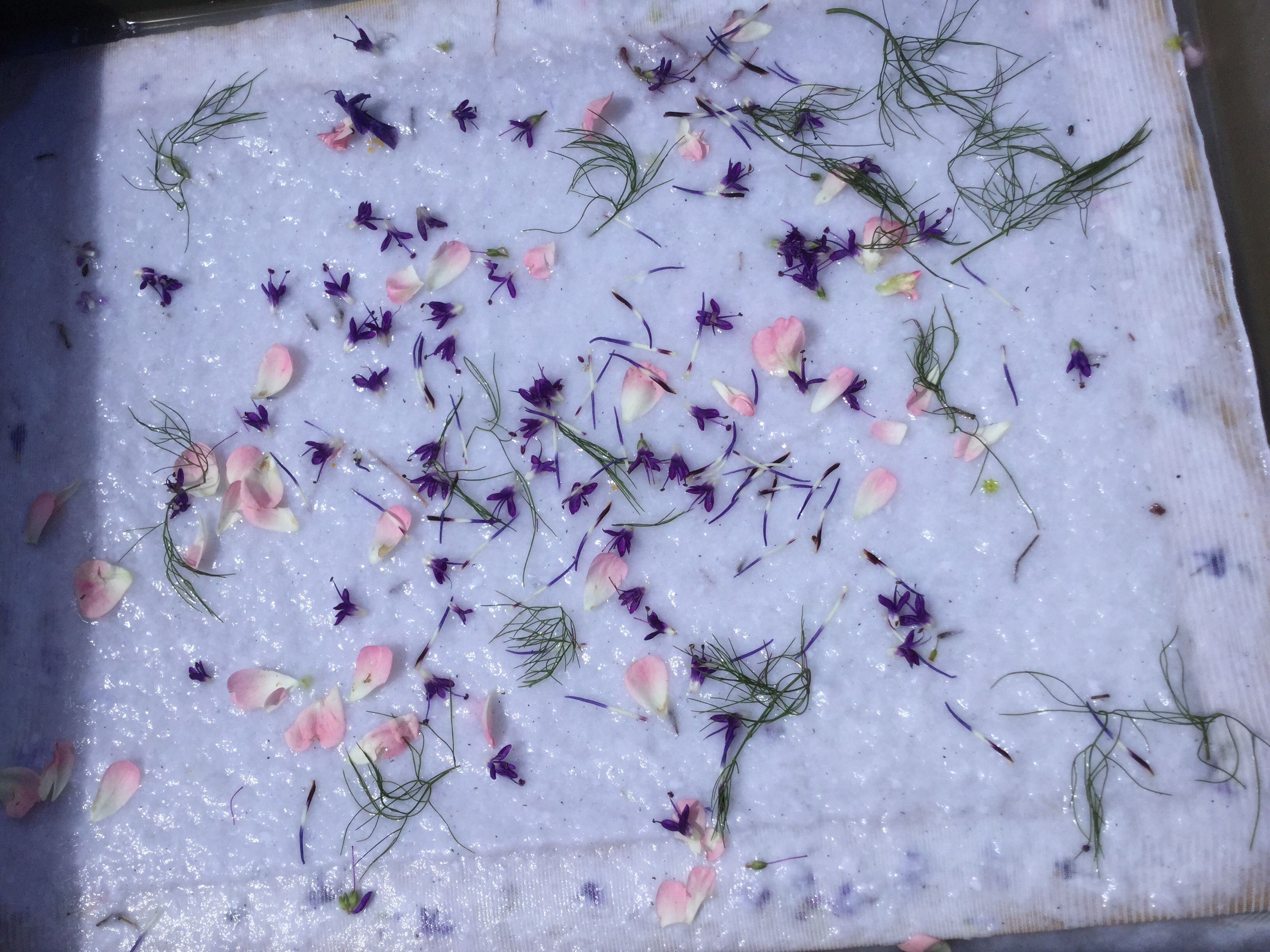 After dipping the screen into the paper pulp mix and adding some flowers and seeds I then turned it over onto a piece of scrap fabric, it was important to sponge the back of the paper through the screen to remove excess water before carefully removing the screen.