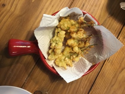 ain flour, beaten egg and a drop of sparkling white wine as there happened to be a bottle open! (You could use beer or sparkling water) you then dip the flowers into the batter by holding onto the main stem, let some of the excess drain off and then fry until golden in hot oil, this only takes a couple of minutes.