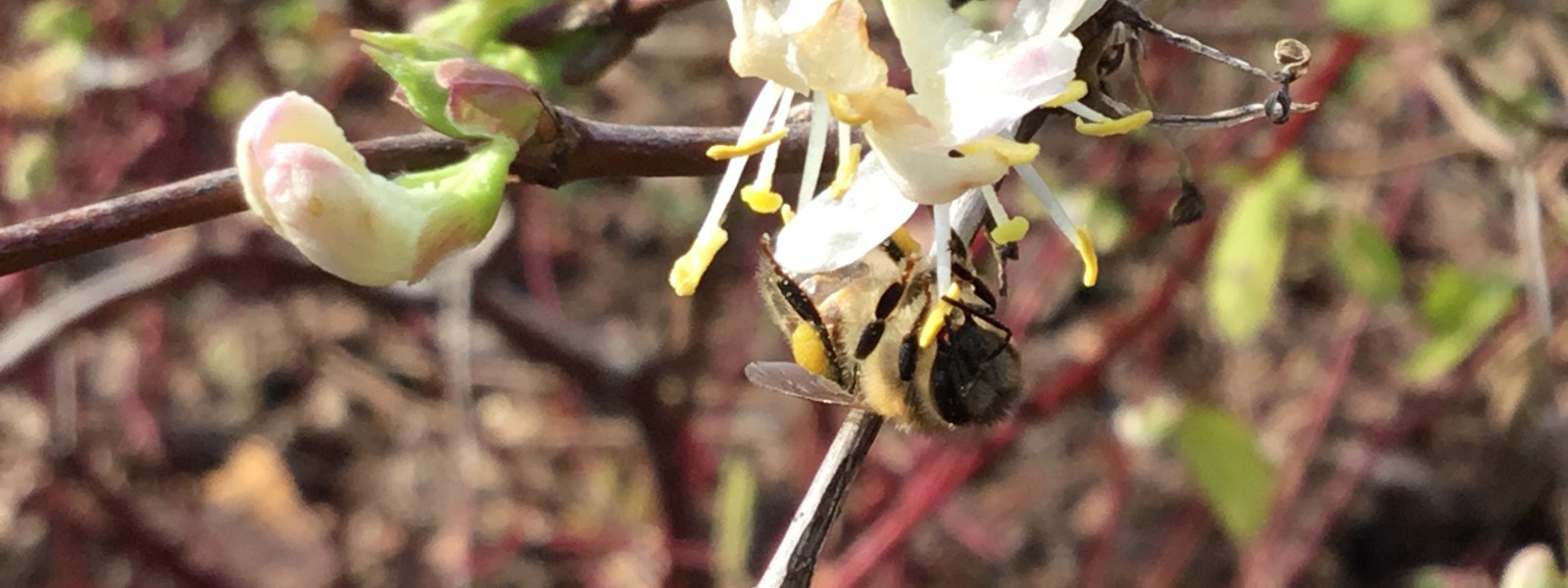My favorite Lonicera if Lonicera x fragrantissima – as the name suggests it is highly fragrant, this semi-evergreen arching shrub produces pairs of scented flowers along the length of its stems from early January until early May. It is a stunning winter flowering plant that provides vital nectar and pollen for bees that get woken from hibernation on those sunny winter days. The sweet fragrance attracts the bees from a wide area and the flowers provides life saving nutrition for them. It is also a superb cut flower – one twig will fragrance a whole room.